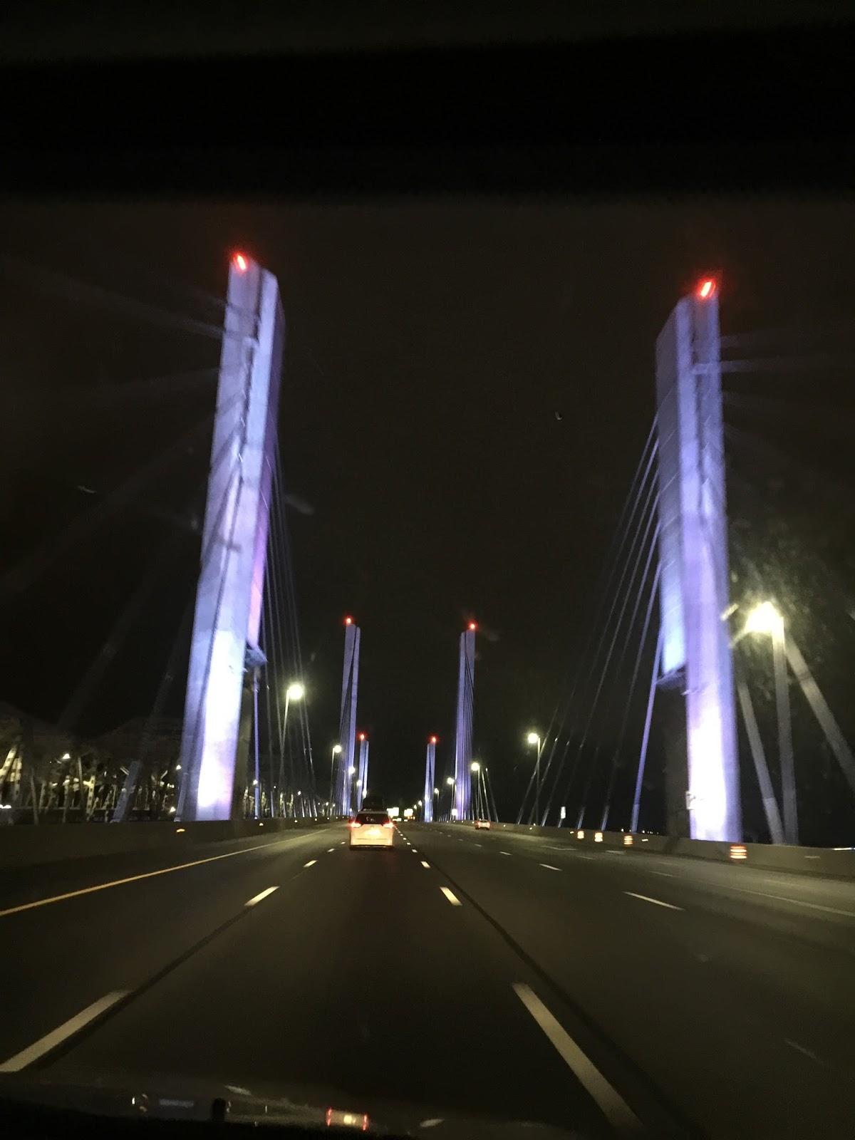 On the way home the traffic was awful. We stopped to try to get a place to stay and everything was booked, so we drove straight through. What should have taken 11 hours took 16. I got home around 2:30-3:00 a.m.As soon as all of those people got off of the road that had rooms booked, the traffic thinned out and we rocked on. The bridges were beautiful at night.